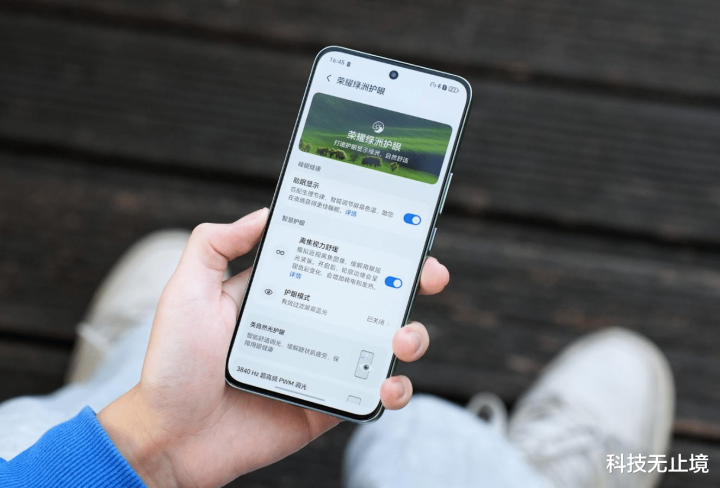 除了性能,其轻薄机身令人印象深刻。厚度仅为 7.7 毫米,重量控制在 196 克,在容纳大电池的前提下保持了出色的握持感。正面是一块 6.7 英寸的 1.5K 分辨率直屏,支持 120Hz 刷新率,视觉体验流畅且细腻。尤为值得一提的是,这块屏幕采用了 3840Hz 高频 PWM 调光技术,并融入 AI 绿洲护眼方案,极大程度上缓解了长时间使用的视觉疲劳,护眼能力处于行业前列。