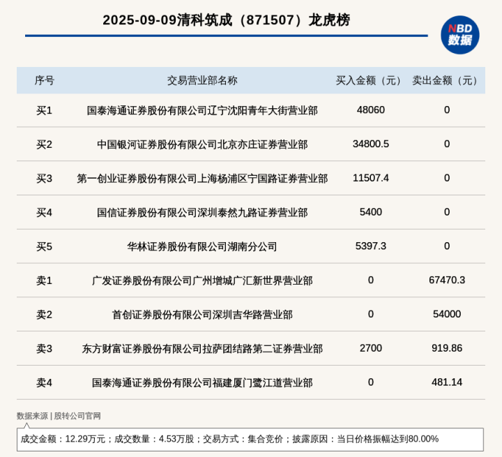 每经讯,2025年9月9日,新三板创新层公司清科筑成(871507,收盘价:4.72元)登上龙虎榜配资门户的申请入口,交易方式是集合竞价,披露原因是当日价格振幅达到80%,成交数量4.53万股,成交金额12.29万元。买一席位为国泰海通证券股份有限公司辽宁沈阳青年大街营业部,买入4.81万元;卖一席位为广发证券股份有限公司广州增城广汇新世界营业部,卖出6.75万元。