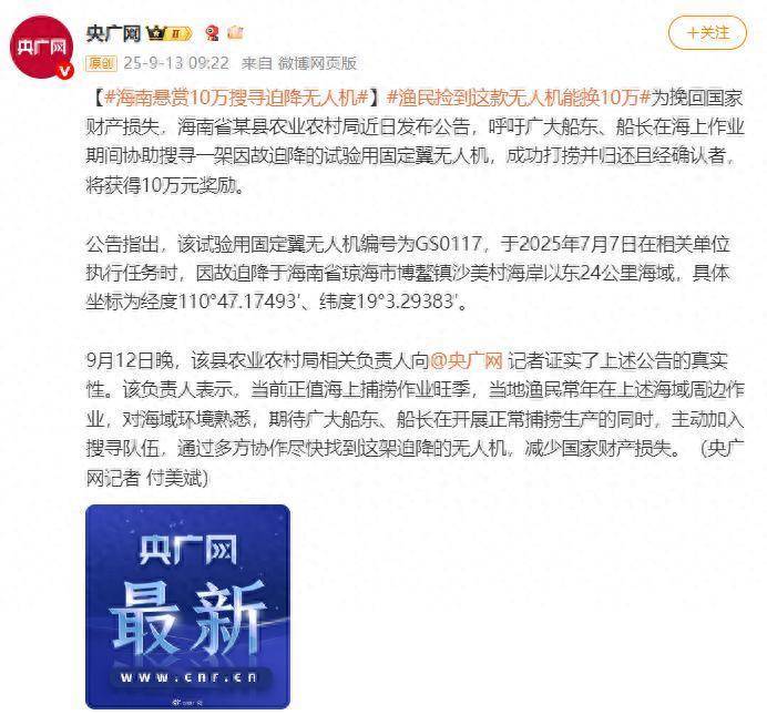 为挽回国家财产损失,海南省某县农业农村局近日发布公告,呼吁广大船东、船长在海上作业期间协助搜寻一架因故迫降的试验用固定翼无人机,成功打捞并归还且经确认者股市配资app官网,将获得10万元奖励。