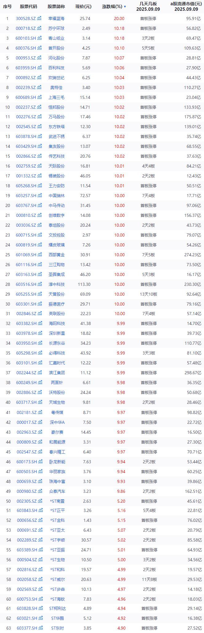涨停热门股:当日沪深京三市共51家个股涨停。天普股份因新能源汽车、股权转让等概念涨停;首开股份因国企改革、房地产概念涨停,且打出4连板;天际股份因锂电池、固态电池概念收获3连板;必得科技因2025中报预增涨停;泰坦股份、传艺科技等因固态电池概念涨停。